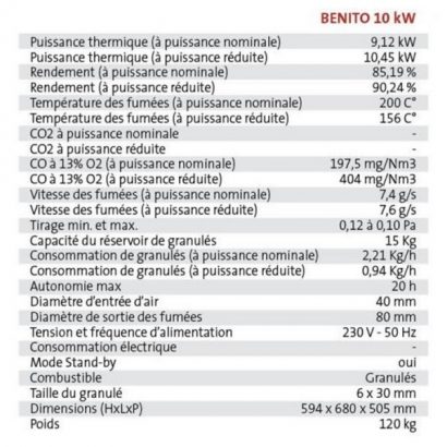 Le Benito d’Interstoves a une autonomie maximale de 26 h et une puissance de 3,11 à 10,36 kW. Cet insert à granulé ventilé s’adapte aussi bien à une rénovation de cheminée qu’à une création. Comme sur la plupart des modèles à chargement frontal, le rail coulisse pour recharger en combustibles, avec une consommation de granulés de 0,94 kg/h à puissance réduite et 2,21 Kg/h au maximum.