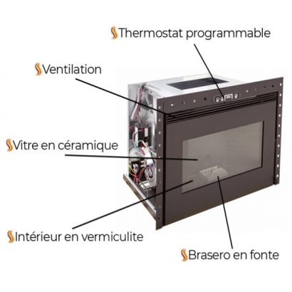 Cet insert à granulé ventilé fournit une bonne puissance, 10,36 Kw, de chauffe pour un rendement maximal de 93,73%. Fonctionnel, il dispose d’une autonomie de 26h et d’un chargement frontal.